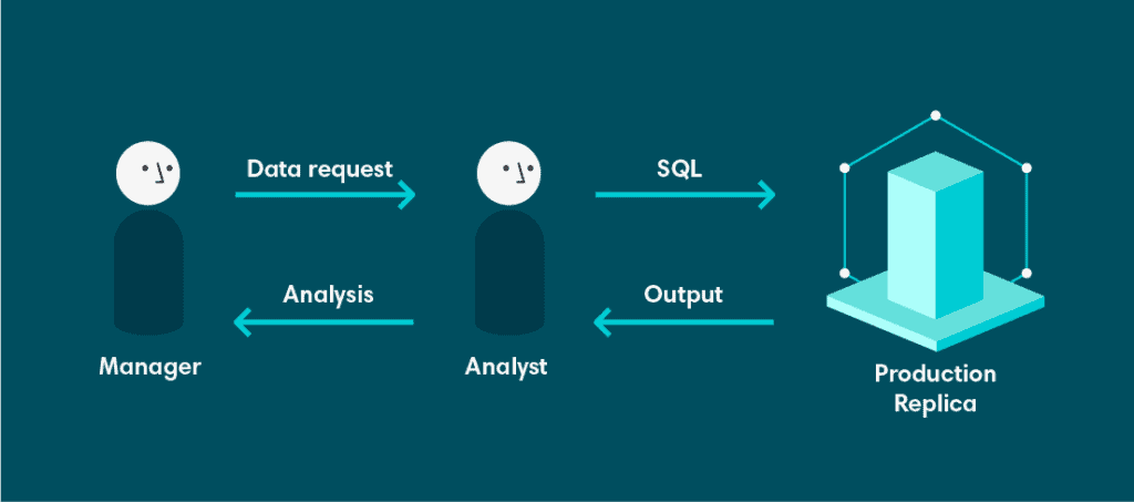Finally, we had limited tooling on top of this replica. That means, if you wanted data, you had to get your hands dirty with SQL. While all of our analysts and developers were comfortable with this, the most demand for data came from product owners and managers that weren’t familiar with SQL. This created a hard dependency on analysts, who now had to spend a large amount of time retrieving data and less time extracting value and insights from data.