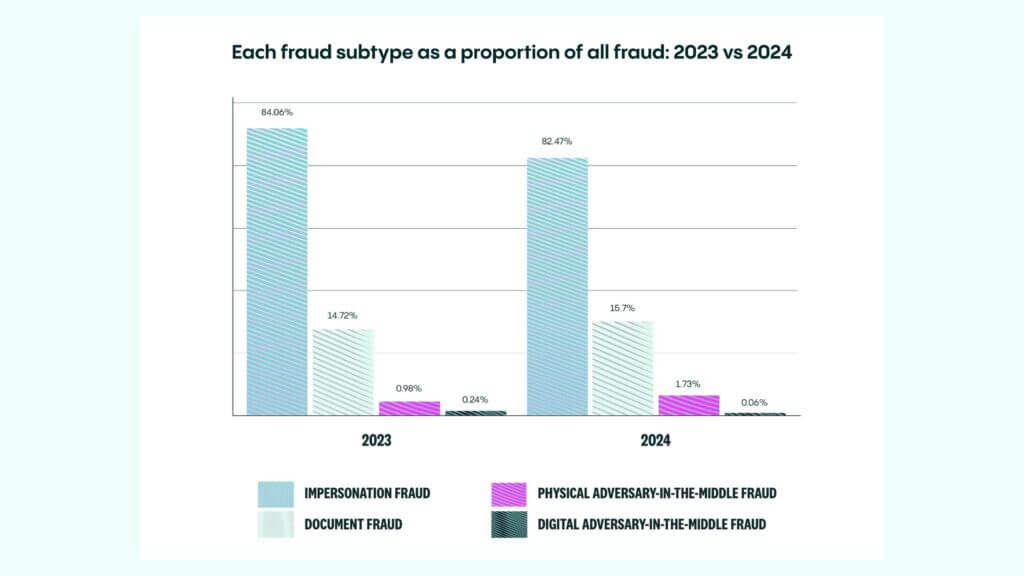 A medida que el fraude sigue evolucionando, los ataques de adversario en el medio (AiTM) se están convirtiendo en una preocupación significativa, particularmente para industrias como servicios financieros, fintech e iGaming. Con un aumento del 46% en los casos de AiTM en solo un año, estas amenazas sofisticadas explotan vulnerabilidades tanto en sistemas digitales como físicos, planteando desafíos que las medidas tradicionales de detección de fraude tienen dificultad para abordar. Si bien el fraude de suplantación sigue siendo el tipo más prevalente de ataque, el rápido crecimiento del fraude AiTM subraya la necesidad de que las organizaciones adapten sus defensas.