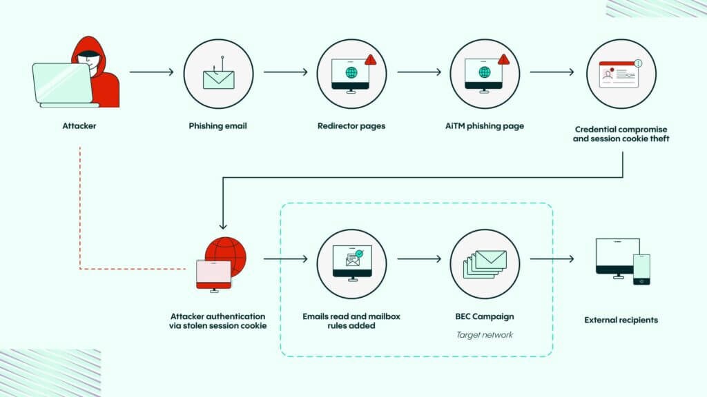 De manera similar, los ataques AiTM (Adversario-en-el-Medio) también apuntan a la confianza del usuario, pero adoptan un enfoque diferente. Estos ataques interceptan la comunicación entre un usuario y un servicio legítimo a través de técnicas de phishing. En un ataque AiTM, el atacante generalmente envía un correo electrónico de phishing que contiene un enlace que dirige a la víctima a una página de inicio de sesión falsa (redirigidor o página de phishing AiTM) diseñada para imitar un servicio legítimo. Cuando la víctima ingresa sus credenciales, el atacante captura estos detalles y también puede robar las cookies de sesión para eludir la autenticación multifactor (MFA). Al usar las cookies de sesión robadas, el atacante puede autenticar su acceso a la cuenta de la víctima, obteniendo acceso no autorizado a correos electrónicos u otros recursos. Este acceso a menudo se explota para campañas maliciosas, como leer correos electrónicos sensibles, alterar reglas de bandeja de entrada o iniciar esquemas de Compromiso de Correos Electrónicos Empresariales (BEC) para dirigir a destinatarios externos en la red de la víctima.