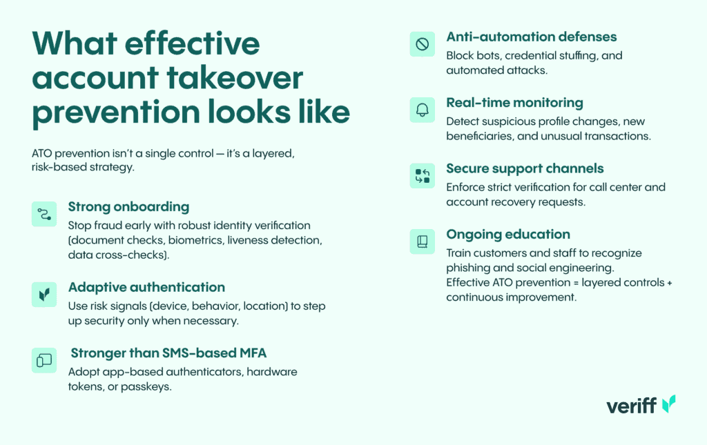 La apropiación de cuentas (ATO) es una de las amenazas más graves y de más rápido crecimiento en la banca digital. Ocurre cuando un estafador obtiene acceso no autorizado a la cuenta bancaria en línea de un cliente, generalmente mediante credenciales robadas, phishing, malware o la explotación de autenticaciones débiles. Una vez dentro, los atacantes pueden transferir fondos, modificar detalles de la cuenta, abrir nuevos productos o cometer fraudes de identidad adicionales, a menudo antes de que el cliente o el banco se den cuenta. Según los últimos datos de fraude de Veriff, las tácticas sofisticadas de fraude, incluidas las técnicas de medios generados por inteligencia artificial y la suplantación, están aumentando rápidamente, lo que hace que las defensas tradicionales sean insuficientes por sí solas.
