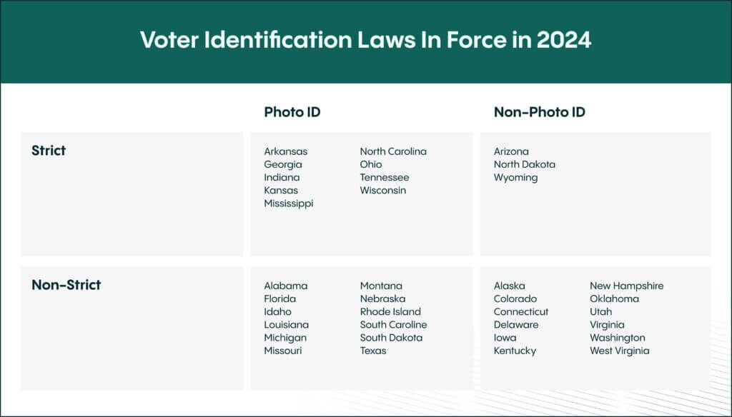Muchos estados en EE. UU. han implementado leyes que requieren que los votantes presenten formas específicas de identificación en las urnas. Estas leyes varían significativamente de un estado a otro, con algunos que requieren identificaciones con foto y otros que aceptan formas de identificación sin foto.
