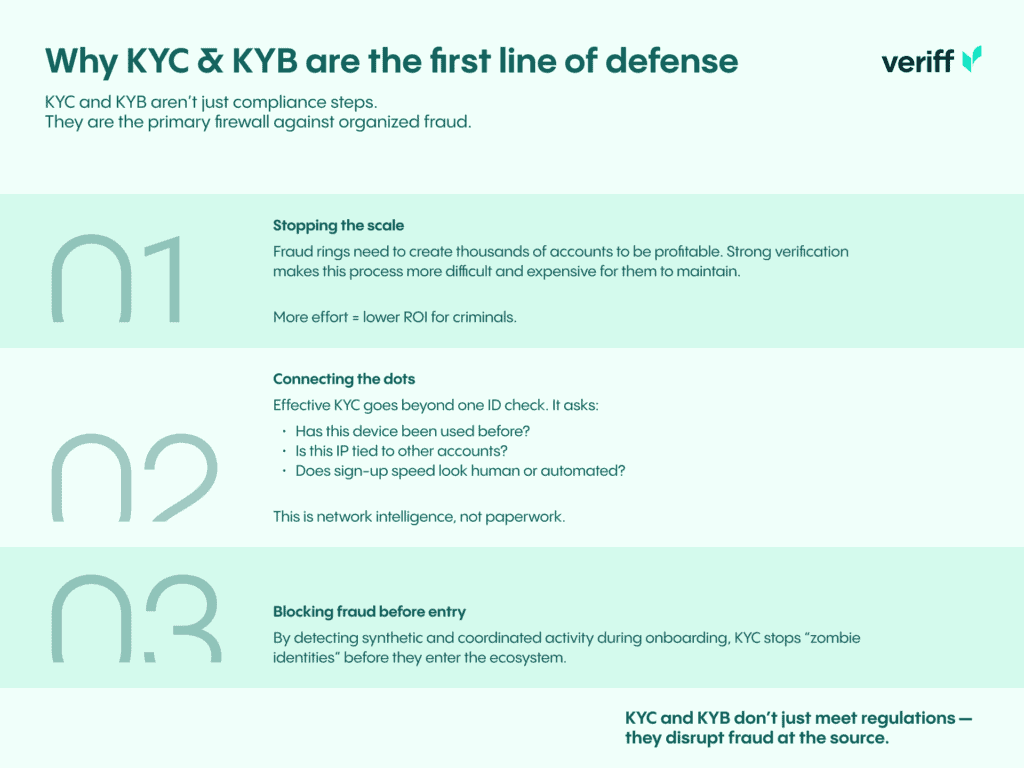 When we talk about KYC (Know Your Customer) and KYB (Know Your Business), we often talk about regulations. But in the context of fraud rings, these processes are about disruption.