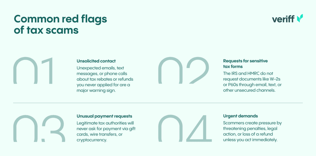 - Requests for tax forms: Agencies like the IRS and HMRC do not request sensitive forms like W-2s or P60s through unsecured channels.
