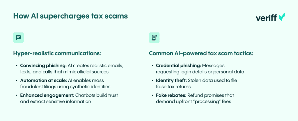 - Automation at scale: AI enables scammers to generate synthetic identities and automate fraudulent tax filings, allowing them to target thousands of victims with minimal effort.