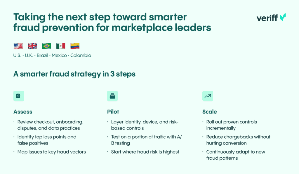 For marketplace decision-makers in the U.S., U.K., Brazil, Mexico, and Colombia, executing a pragmatic fraud strategy means three concrete steps: