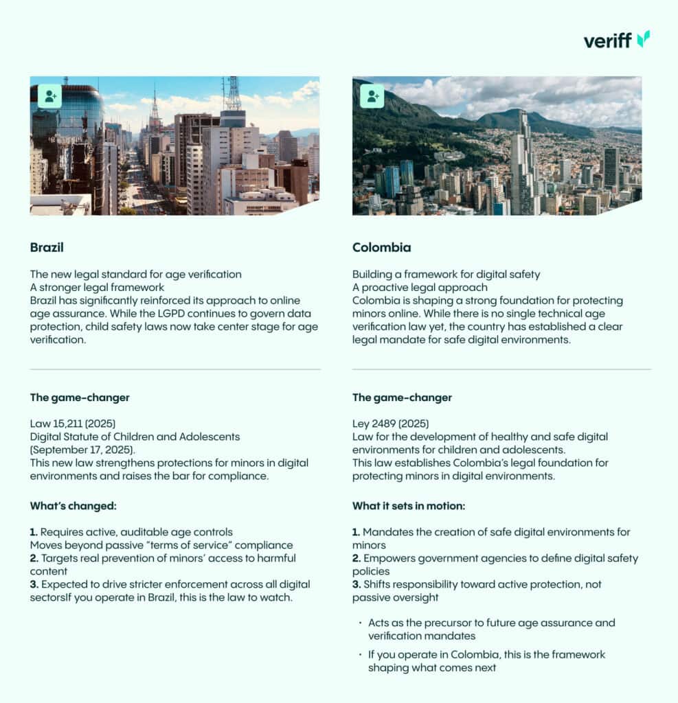 Age verification laws in Brazil and Colombia represent a broader shift toward active digital responsibility. With Brazil’s Law 15,211 and Colombia’s Ley 2489, regulators are signaling they want auditable controls that protect minors.