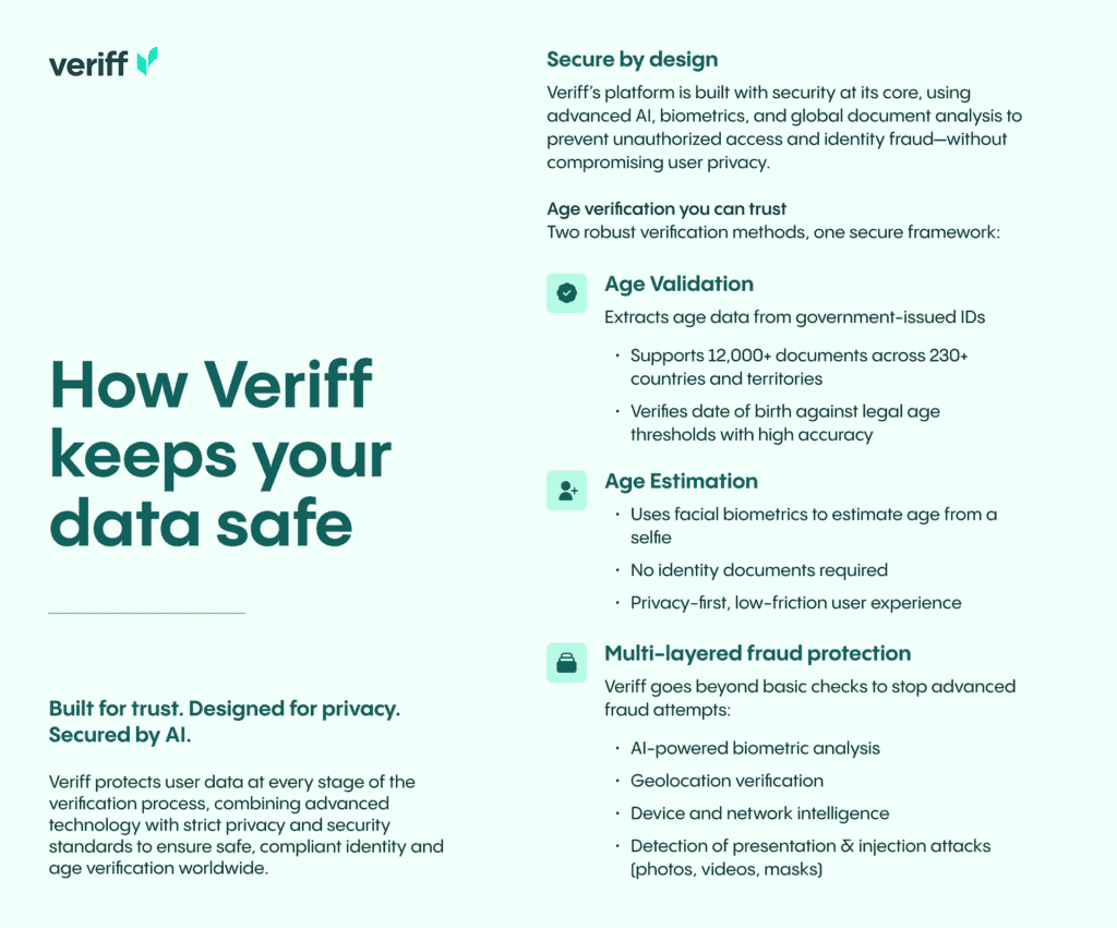 Veriff delivers industry-leading age verification solutions by leveraging advanced AI, biometrics, and global document analysis. Our technology ensures that access to restricted content, goods, or services is granted only to age-appropriate users, maintaining full compliance with geo-specific regulations. We provide two robust methods for verification: