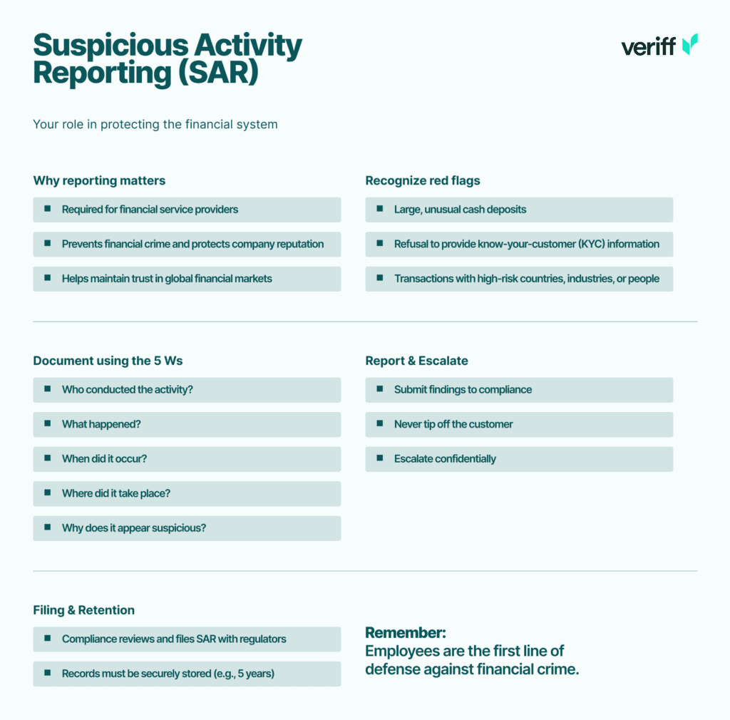 Filing a suspicious activity report (SAR) is a legal obligation for financial service providers in most jurisdictions. Failure to report suspicious activity can lead to severe penalties, reputational damage, and even criminal liability. This guide ensures your employees understand their role in detecting, documenting, and reporting suspicious activity.