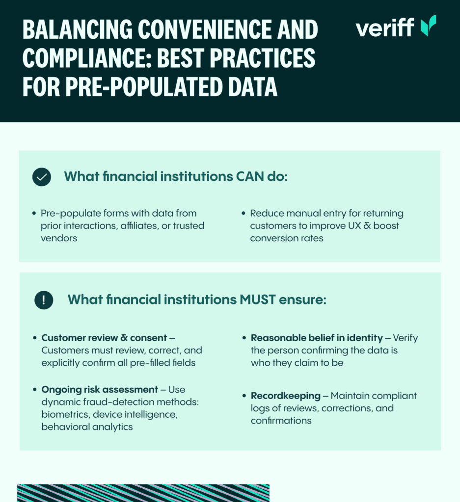 However, less friction cannot mean less vigilance. The FDIC is clear that using pre-filled data is only compliant when banks have robust measures in place to ensure that the right person is providing and verifying their information. Preventing identity fraud, account takeover, and other forms of financial crime remains paramount.