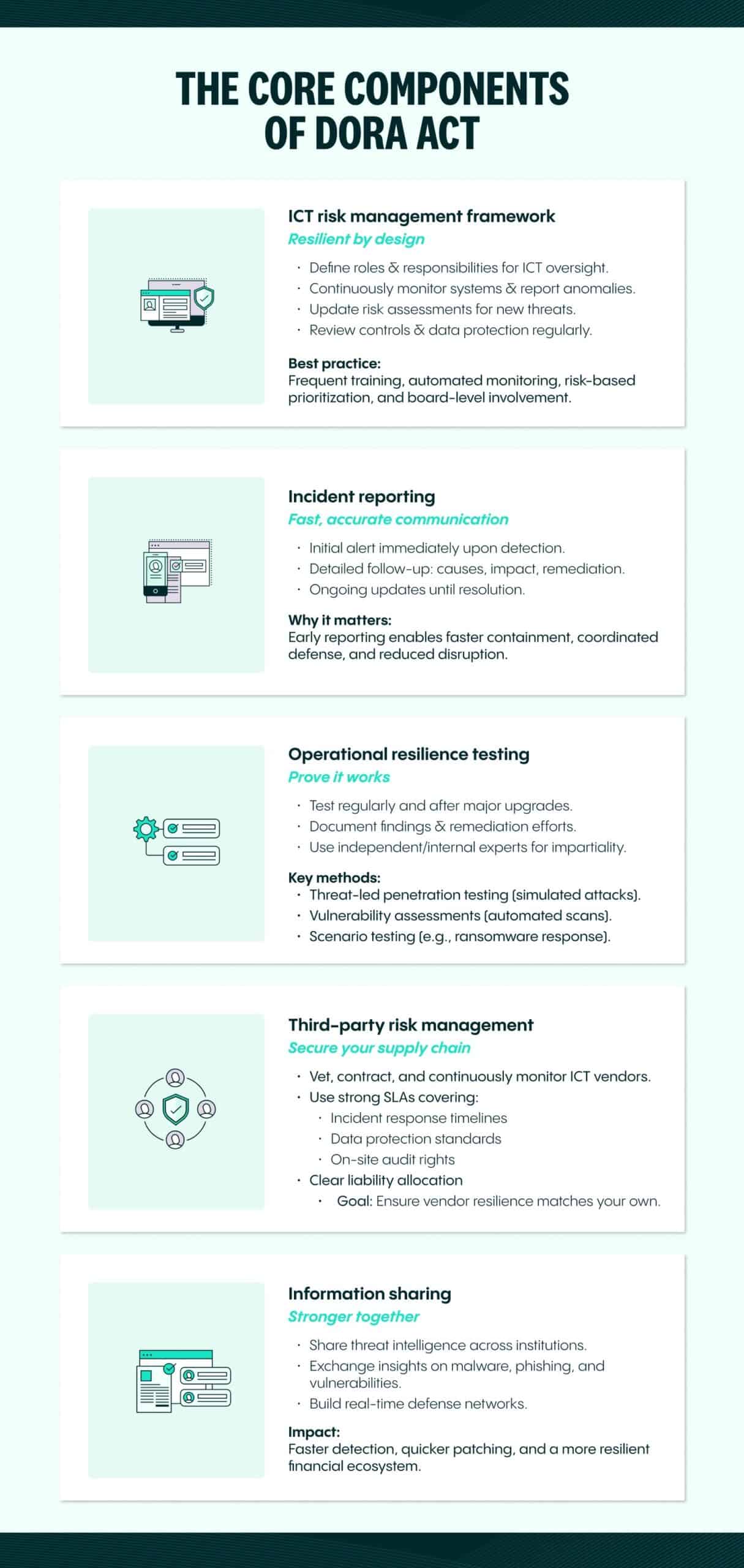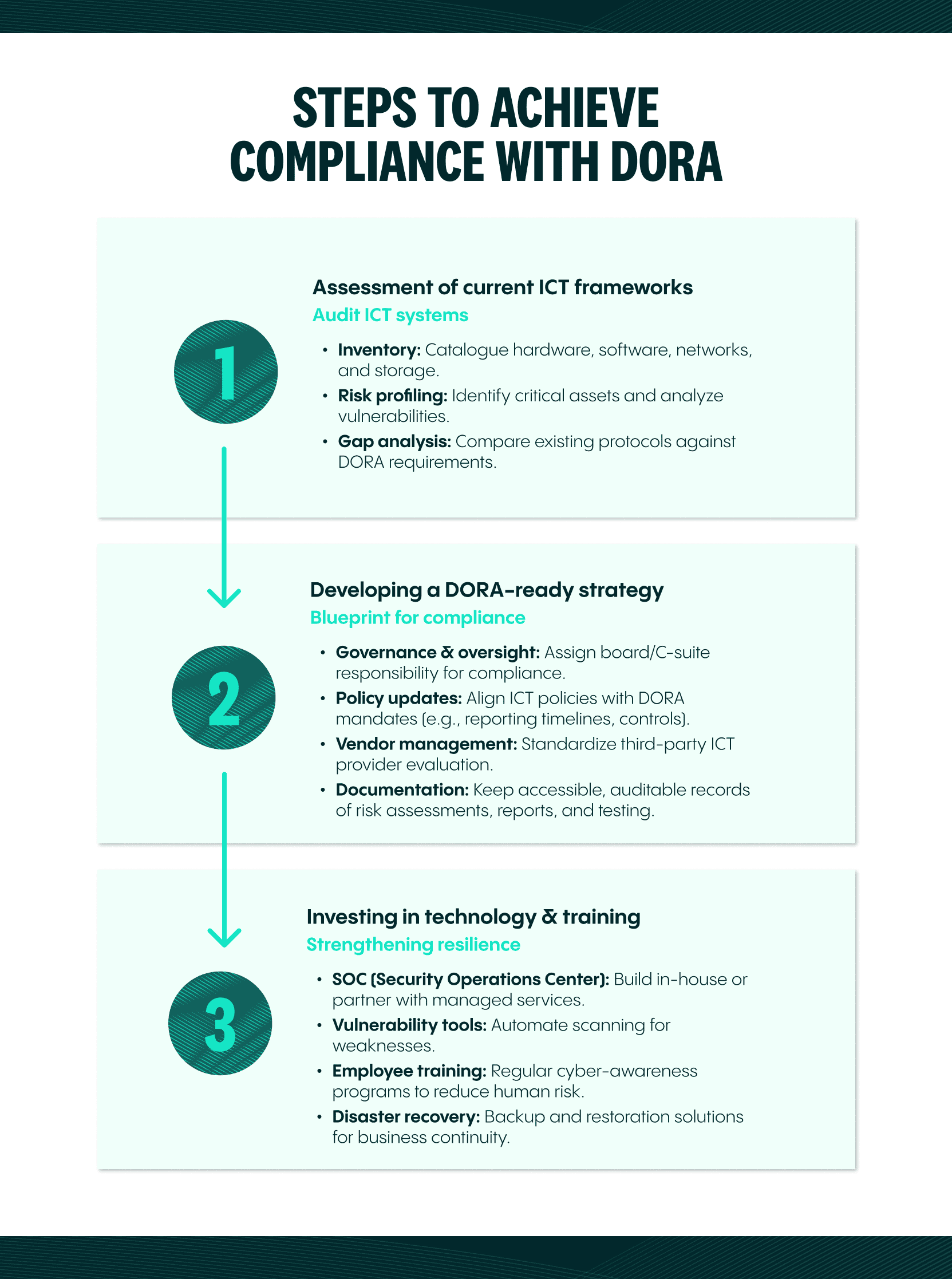 - Ongoing monitoring: Continuous audits and compliance checks to meet or exceed the baseline set by the DORA.