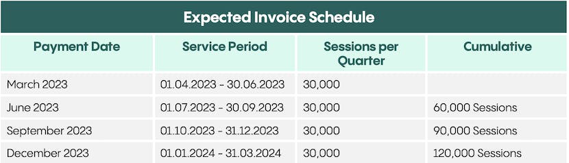 Service Fee under the Order Form will be invoiced in equal amounts (except for annual and monthly in arrears Payment Schedules), based on the Payment Schedule indicated in the Order Form. For clarity, the invoiced amount assumes that the number of Initial Sessions used during the applicable Payment Schedule period will be used in equal amounts.