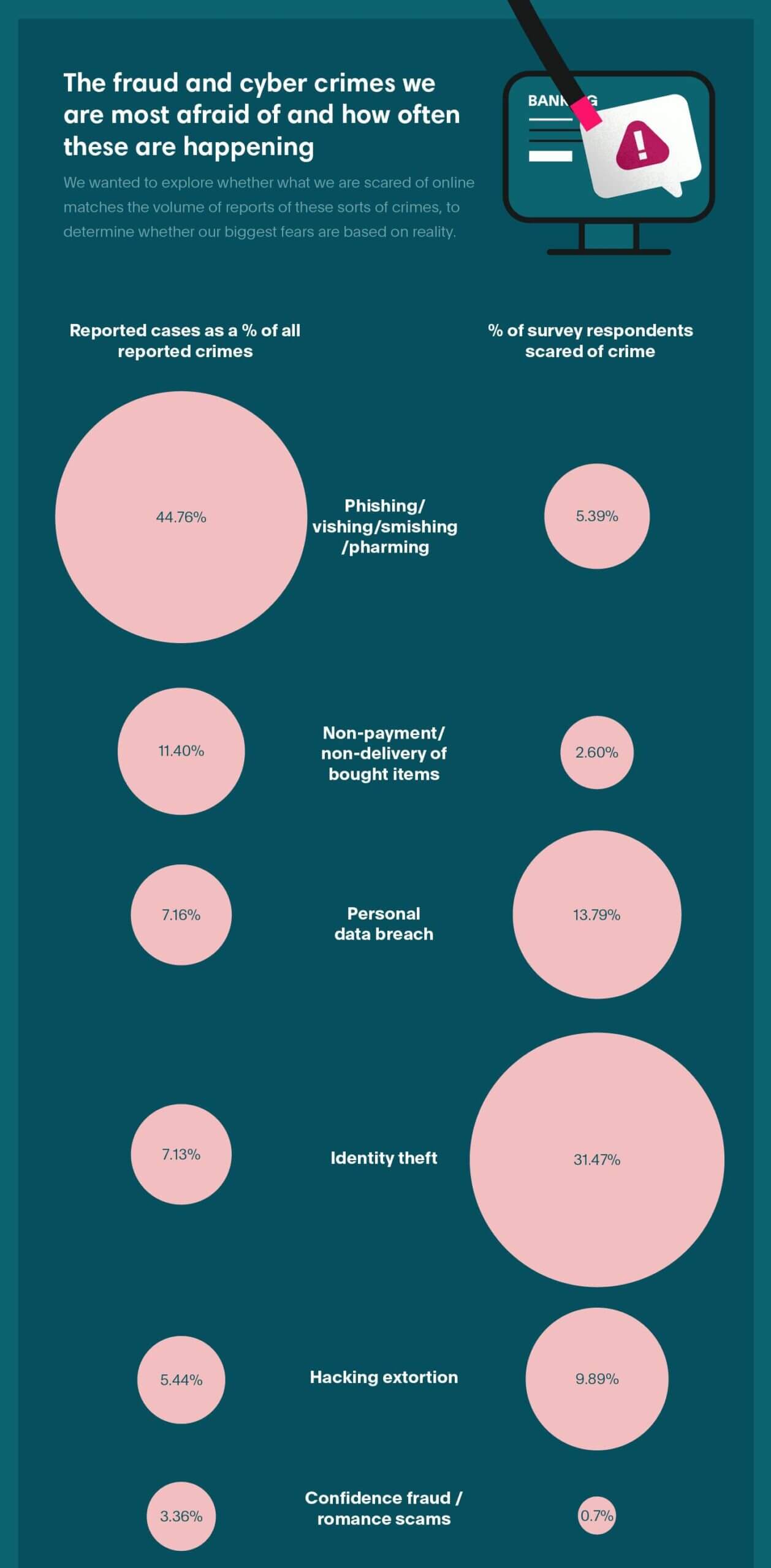 87% dos entrevistados afirmaram que tinham medo de serem vítimas de um crime cibernético ao usar a internet, com quase um em três temendo o roubo de identidade. É fácil ver por que, já que, de acordo com o Relatório de Crimes da Internet do FBI de 2021, que analisou relatórios em 2021, houve 496.501 relatos de crimes cibernéticos e um total de US$6.117.058.765 foi perdido em todo os EUA.