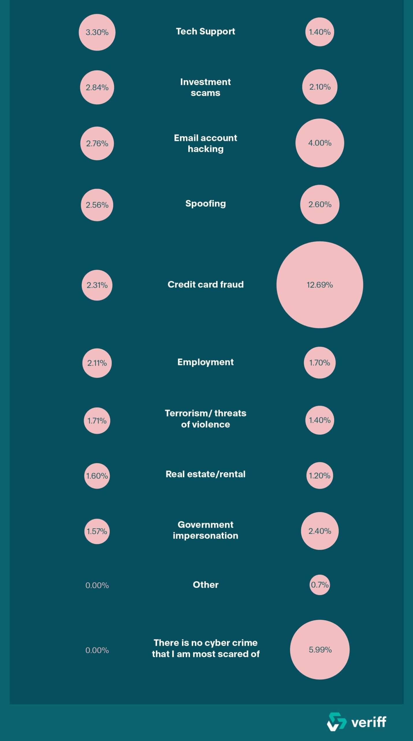 Aqui na Veriff, sabemos como é importante ficar seguro online. Por isso, quisemos descobrir quais fraudes e crimes cibernéticos estão sendo relatados com mais frequência, quais estão nos custando mais e com quais estamos mais preocupados. Analisamos dados de busca no Google e uma pesquisa com 1.000 adultos nos EUA, juntamente com os dados do Relatório de Crimes da Internet do FBI de 2021, para descobrir do que mais temos medo online e com que frequência essas coisas estão acontecendo.
