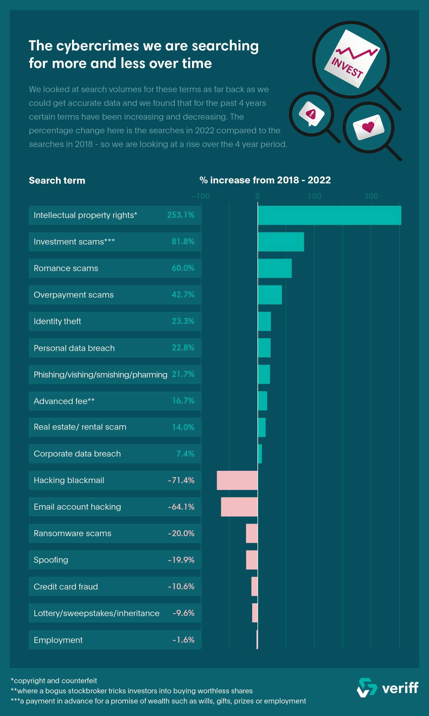 ‘Fraudes de investimento’ é o segundo termo de crescimento mais rápido, com um aumento de 82% nas buscas desde 2018. Isso pode ter sido resultado de criminosos aproveitando-se de pessoas vulneráveis que podem ter encontrado dificuldades financeiras desde a pandemia de COVID-19.