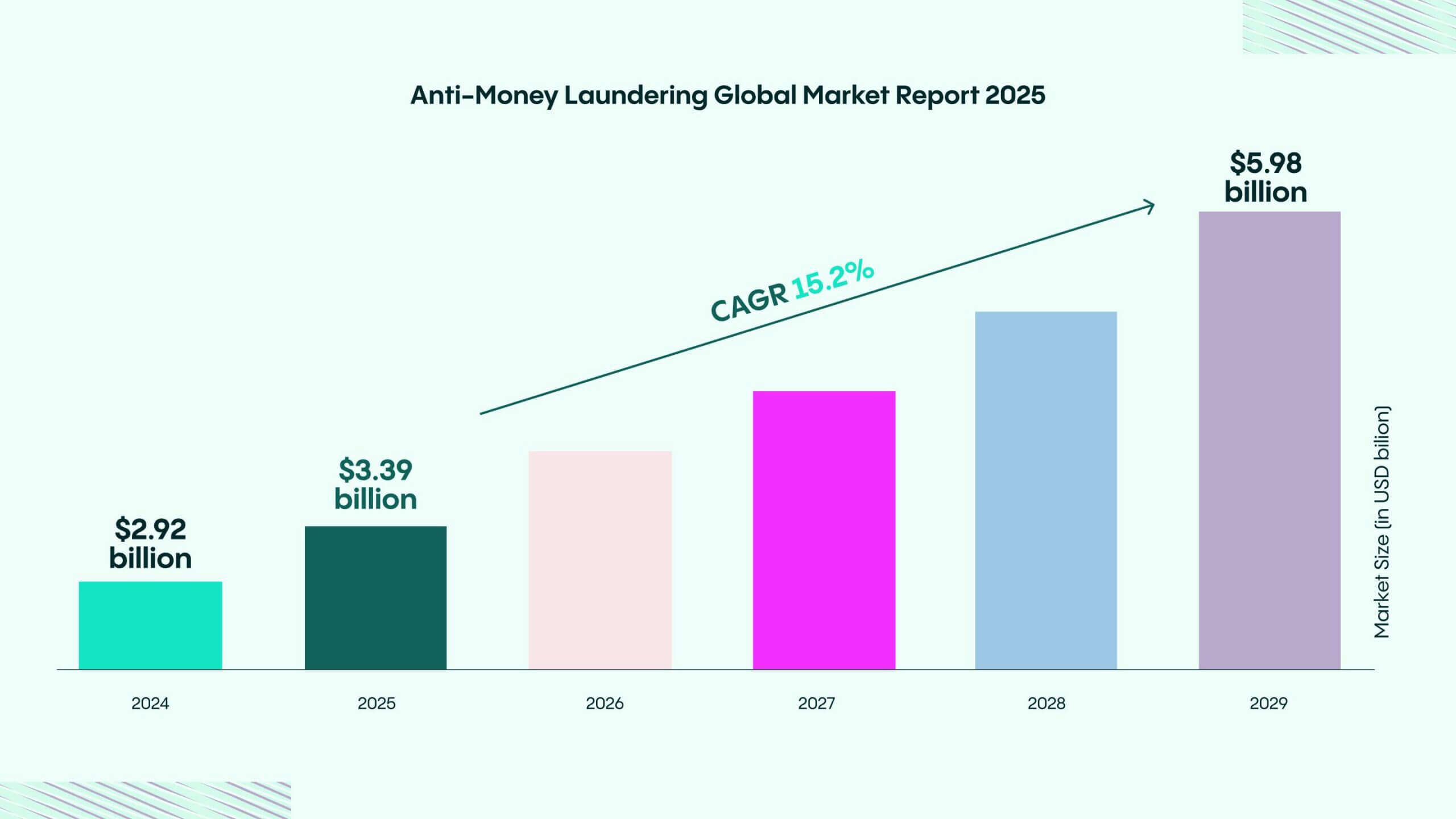 Como resultado, o combate à lavagem de dinheiro se tornou uma preocupação crescente para governos, reguladores e instituições financeiras em todo o mundo. Relatórios indicam que os casos de lavagem de dinheiro estão aumentando, conforme evidenciado pelos dados do Relatório sobre Lavagem de Dinheiro 2022 da Eurojust e outras fontes globais. De acordo com o Relatório de Mercado Global sobre Anti-Lavagem de Dinheiro da The Business Research Company 2025, o mercado deve crescer de US$2,92 bilhões em 2024 para US$3,39 bilhões em 2025, com uma taxa de crescimento anual composta (CAGR) de 16%.