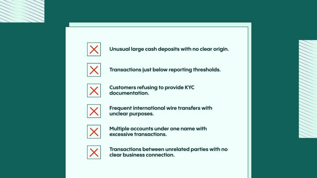 Reconhecer os sinais de alerta da lavagem de dinheiro é crucial para oficiais de conformidade e instituições financeiras. A conformidade contínua é essencial para manter a aderência às regulamentações de KYC e PLD, garantindo que políticas e procedimentos sejam regularmente atualizados para se adaptar a cenários regulatórios em mudança. Os sinais de alerta comuns incluem: