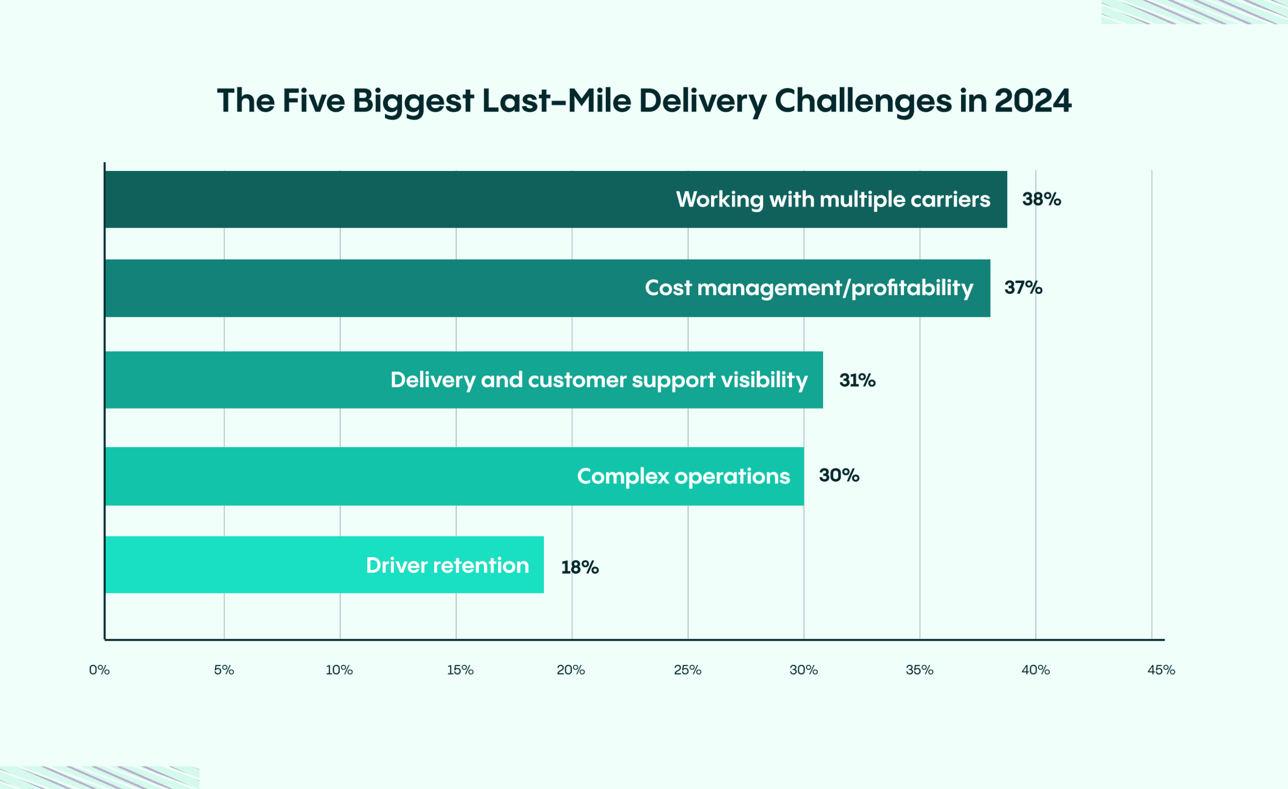 A entrega na última milha frequentemente representa mais de 50% das despesas totais de envio. Questões como rotas ineficientes, entregas fracassadas, consumo de combustível e custos de mão de obra contribuem para elevar esses custos. Manter a lucratividade nas operações de entrega é outro desafio significativo; 37% dos profissionais do setor reconhecem a gestão de custos como um grande obstáculo. O aumento dos preços do combustível, despesas variáveis de mão de obra e rotas não otimizadas continuam a pressionar margens de lucro já apertadas. As empresas precisam encontrar uma forma de atender às expectativas competitivas de entrega enquanto controlam os custos.
