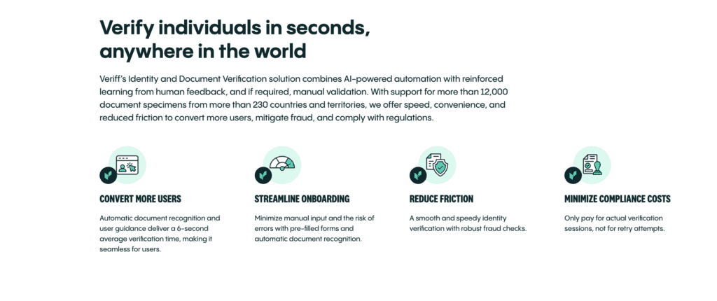 - Experiência do usuário sem atritos: Os fluxos intuitivos e o tempo rápido de verificação da Veriff minimizam a fricção para seus clientes. Ao tornar o processo rápido e amigável, a Veriff ajuda empresas a manterem uma experiência positiva para clientes enquanto priorizam a segurança.